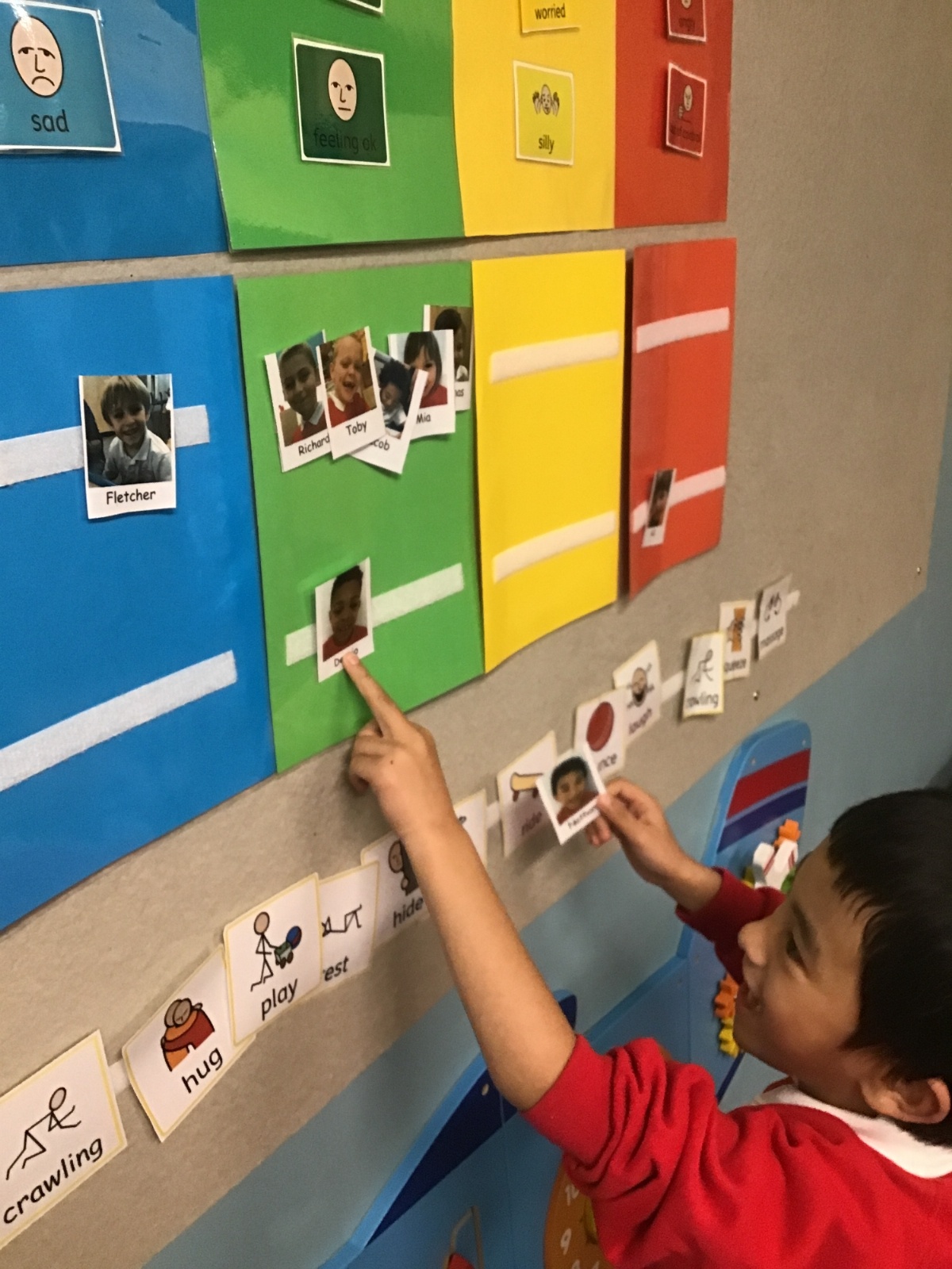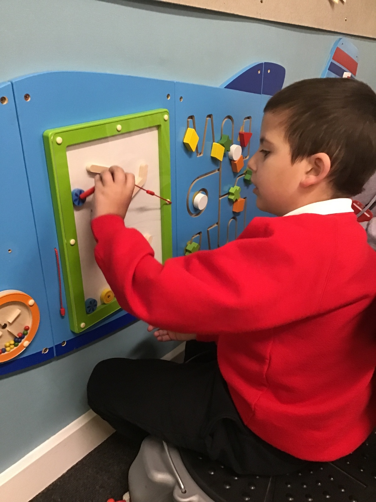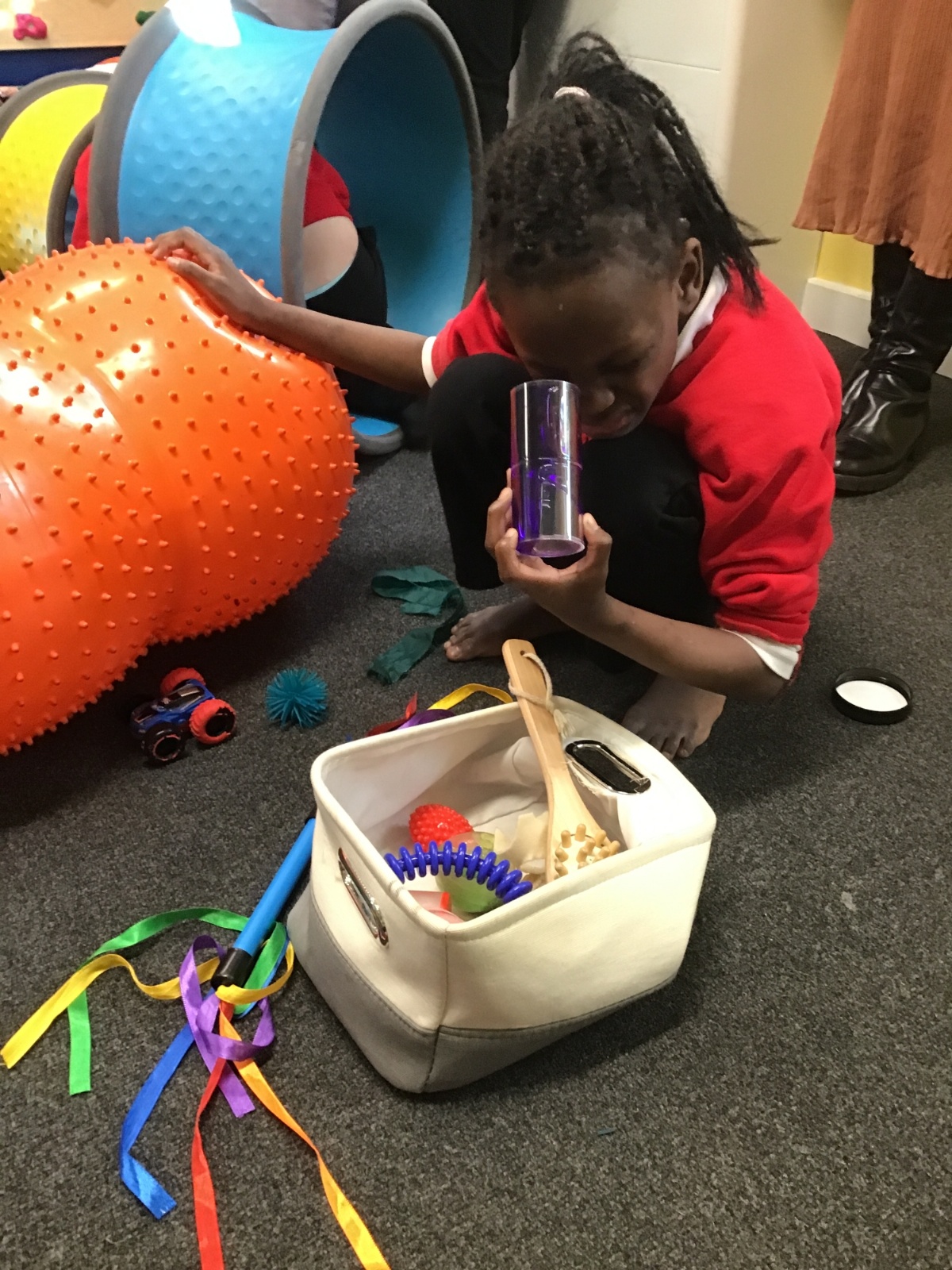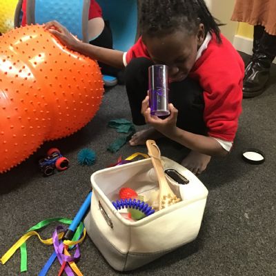 They are using mirror, busy board, liquid timers and other toys for visual and tactile exploration