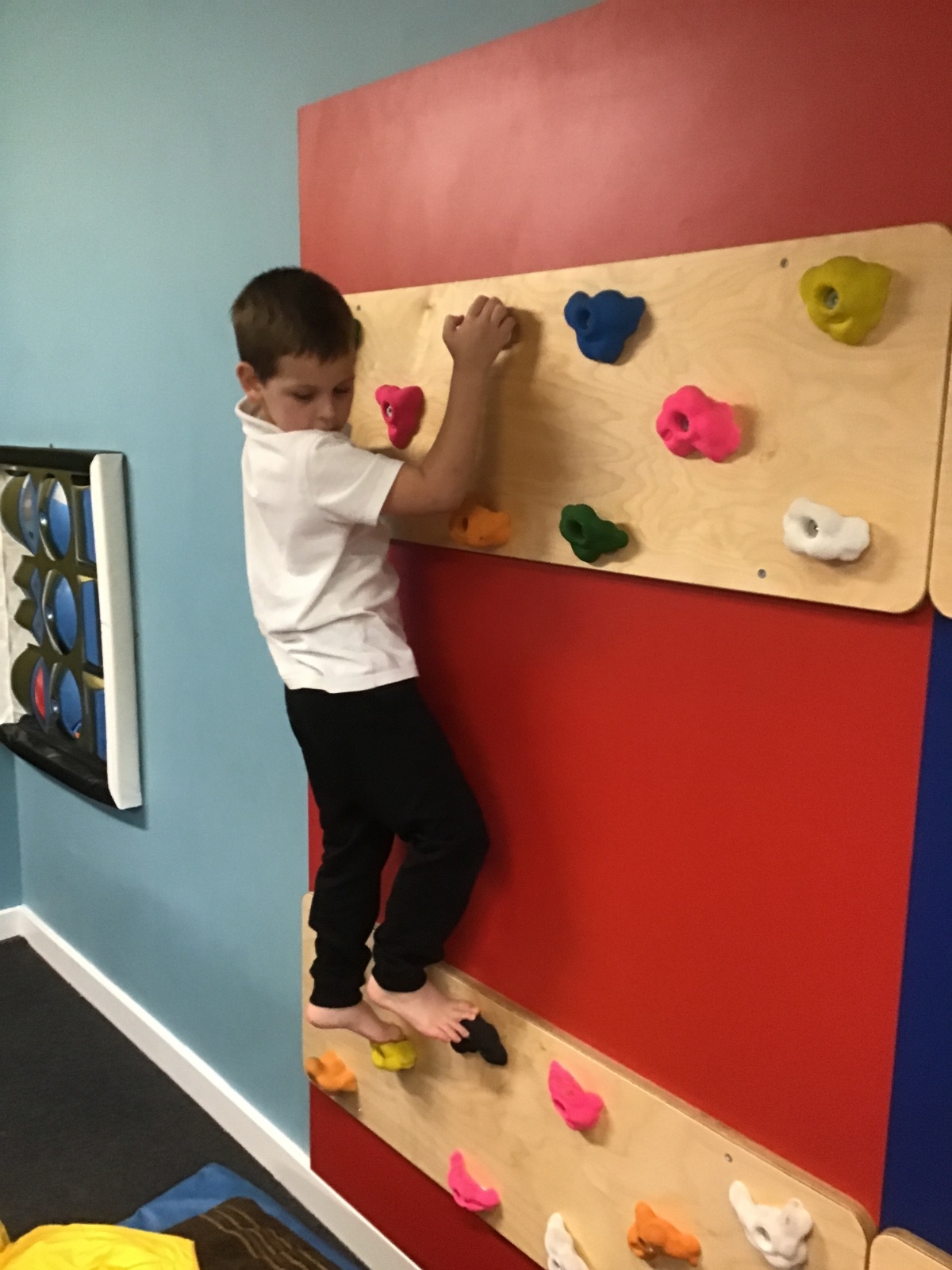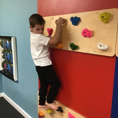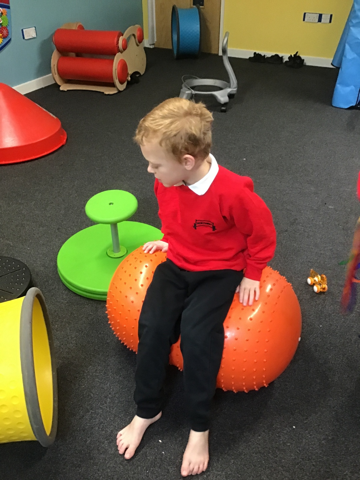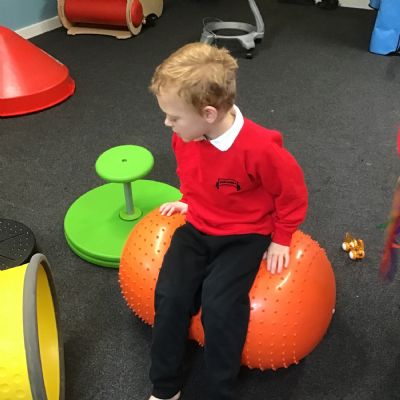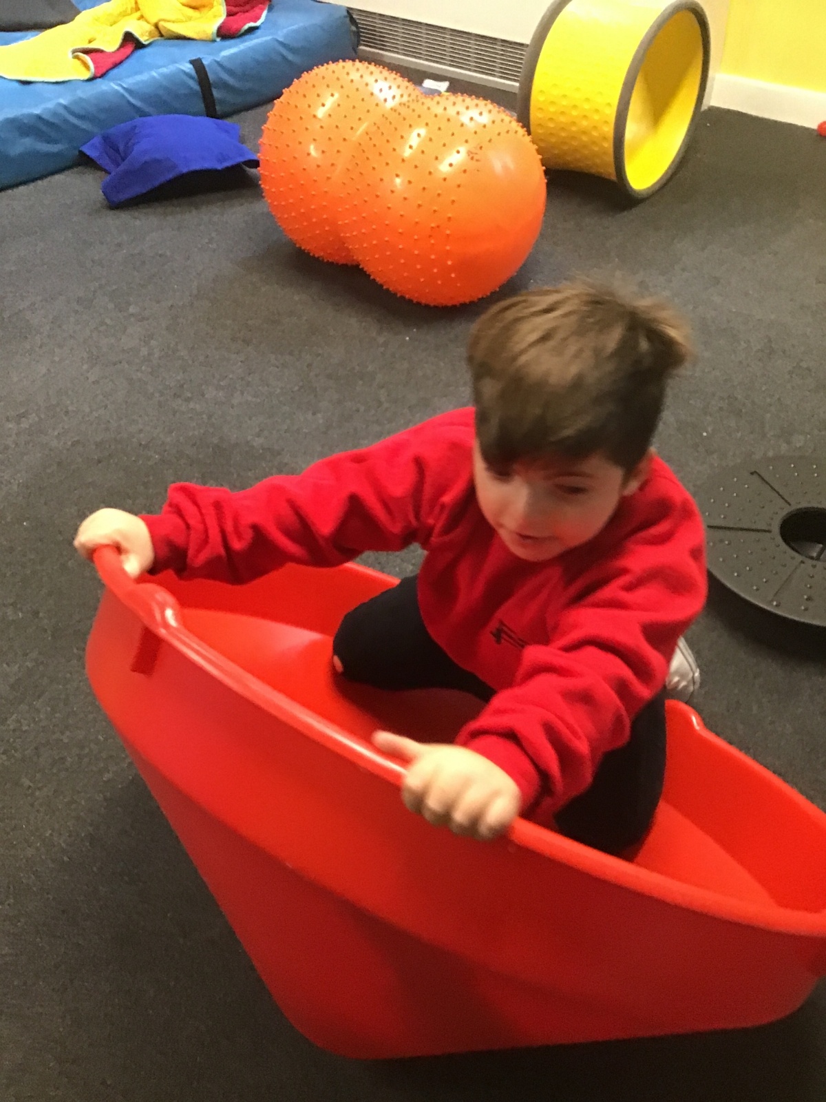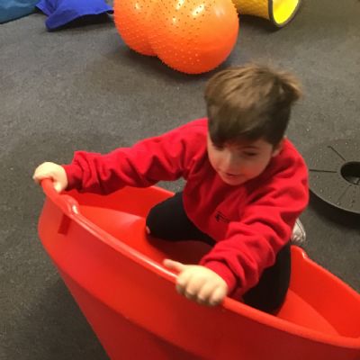 Students are using equipment for vestibular and proprioceptive input: spinning, balancing, bouncing, crawling, climbing and riding body board