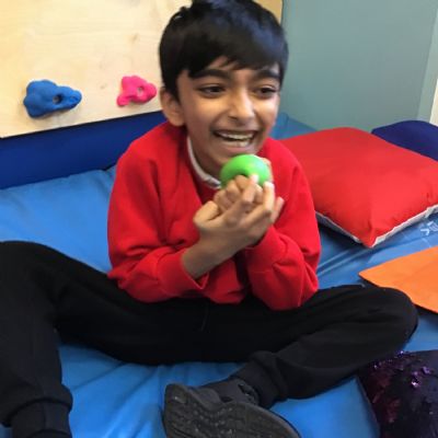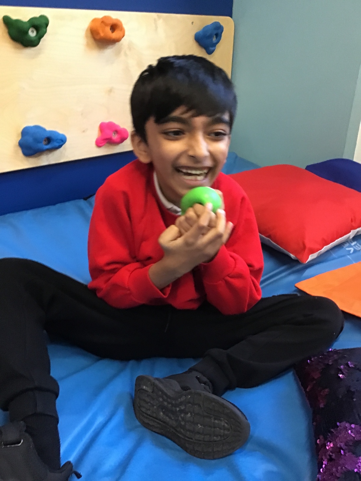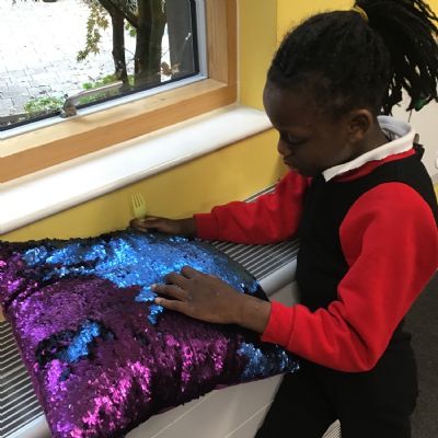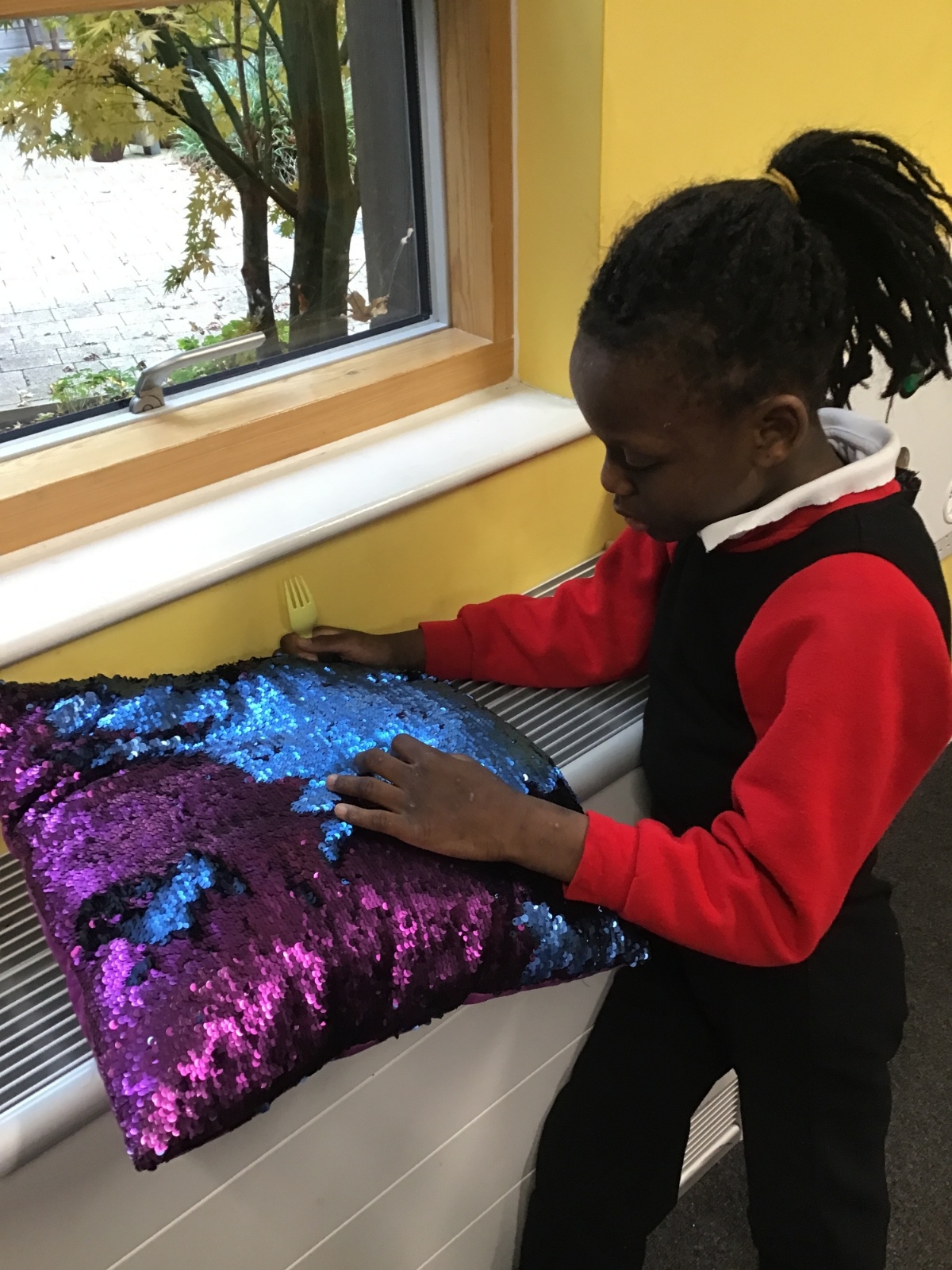 Sometimes quiet time is needed in the safe space, under blanket or with sequin cushion